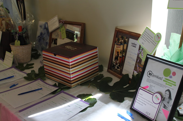 As luck should have it, I have just enough pink tablecloths (used several years ago for my niece's baby shower) to cover the dessert and food table. Borrowed original paintings (from a friend and fellow coordinator) accentuating some of the theme colors combined with the greeneries and other accessories, created a feel of an outdoor garden setting brought inside!